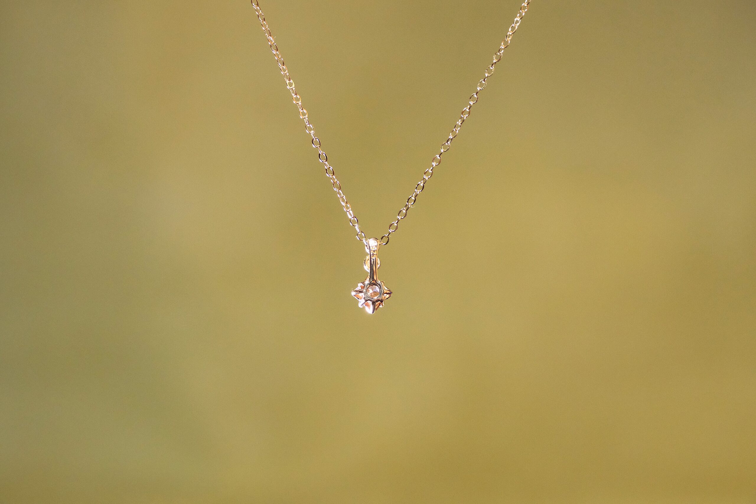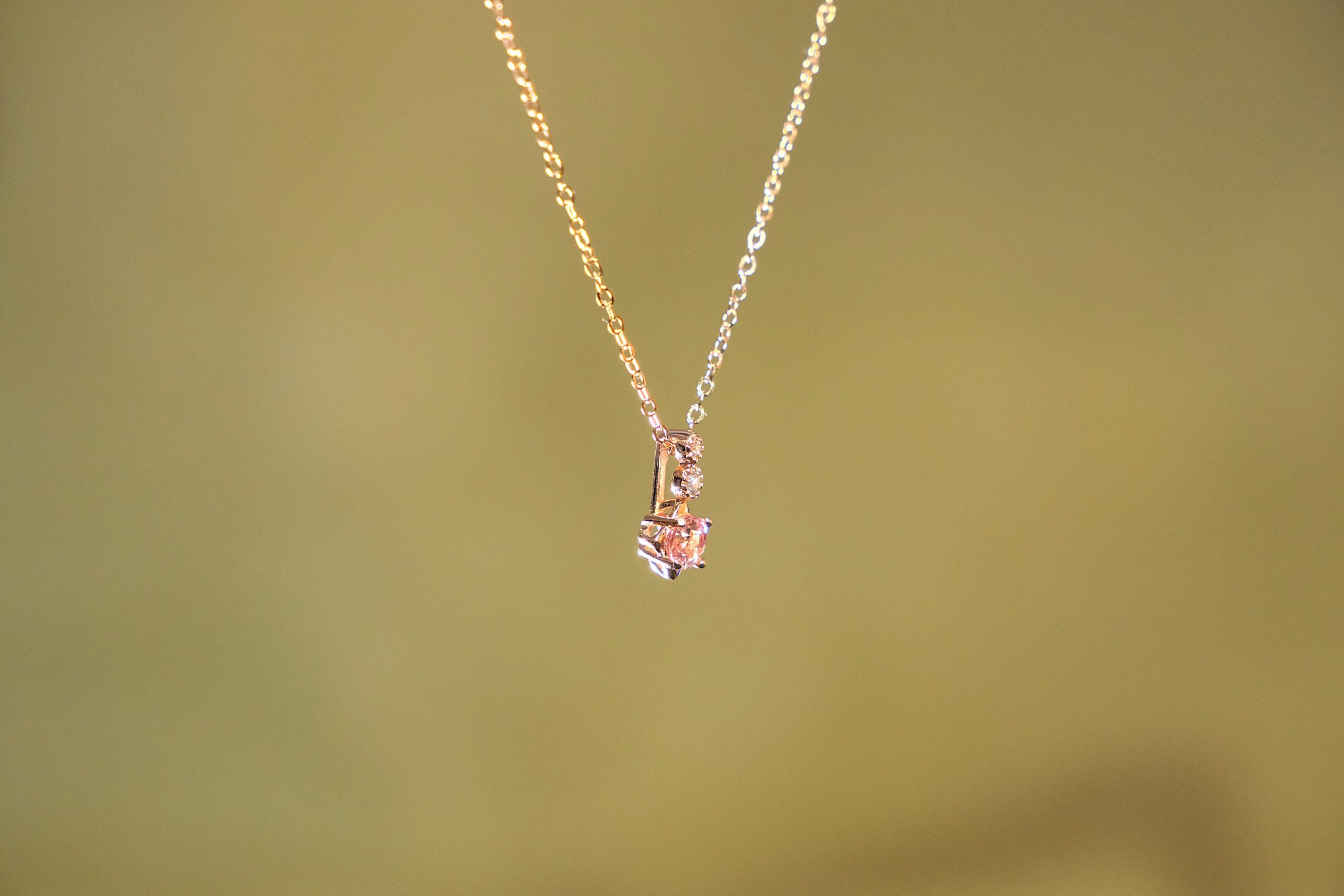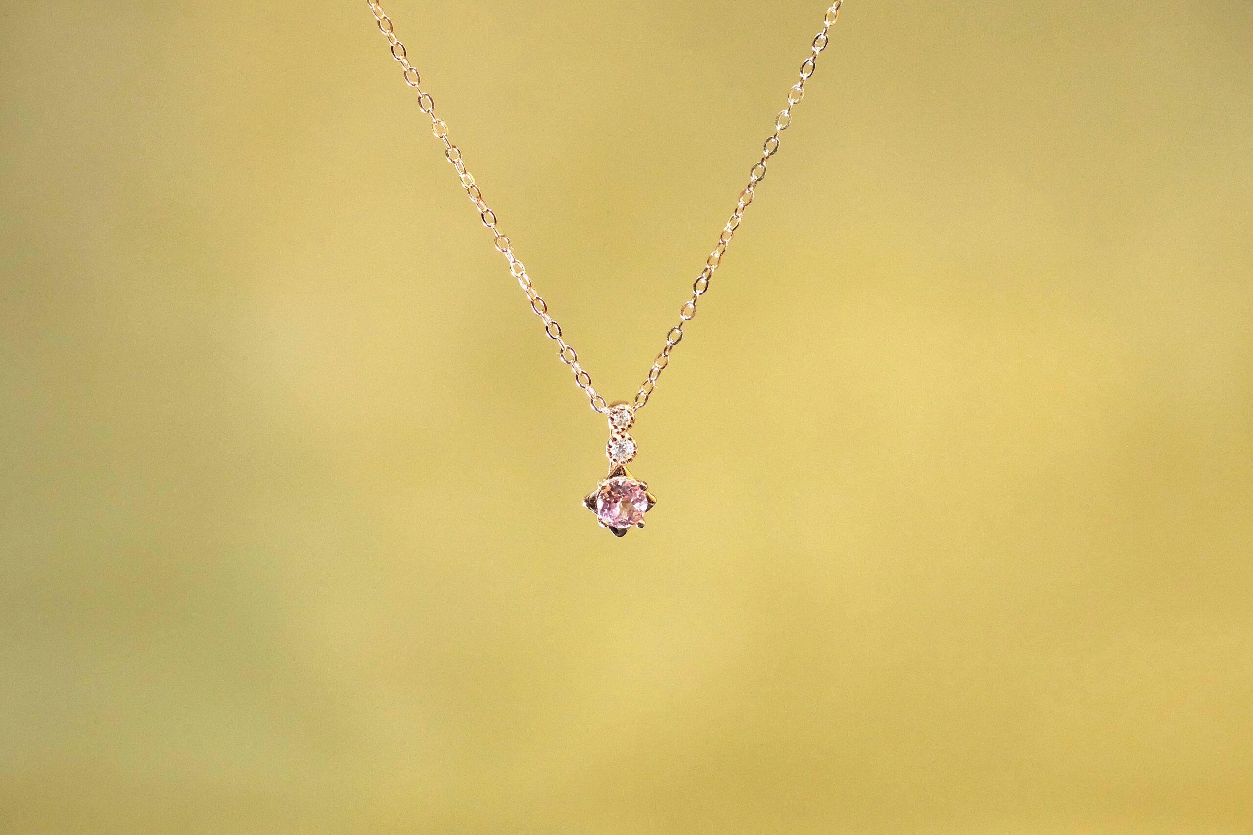愛の守護石とも称されるピンクサファイア。その中でも、肌を美しく見せる絶妙なニュアンスカラーの石を厳選しました。 『Rosée d’Aurore(ロゼ・ド・オロール)』は、朝露が陽の光を浴びて煌めく瞬間を切り取ったかのような、瑞々しくもエレガントなペンダントです。